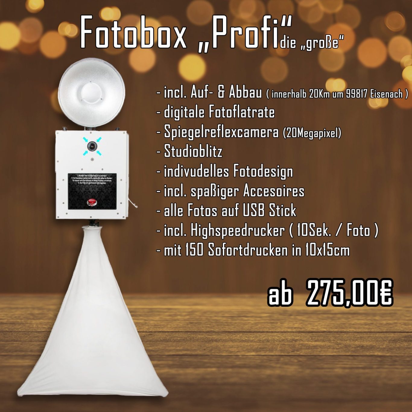 Die Fotobox „PROFI – die Große“ ist die richtige Wahl, wenn es ein bisschen mehr sein darf. Hochwertige Technik, starke Ausleuchtung und gestochen scharfe Bilder sorgen für echte Studioqualität – mitten auf Ihrer Feier.