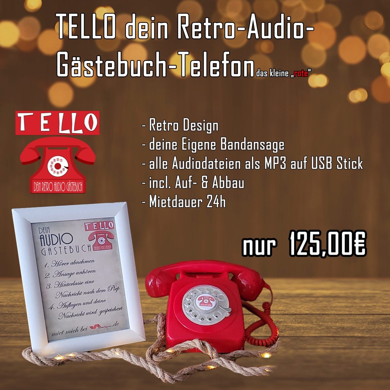 TELLO – das Retro-Audio-Gästebuch-Telefon sammelt keine Einträge, sondern echte Erinnerungen. Ihre Gäste greifen zum Hörer, sprechen spontan ihre Wünsche, Gedanken und Glücksmomente ein – ehrlich, ungefiltert und oft überraschend berührend.