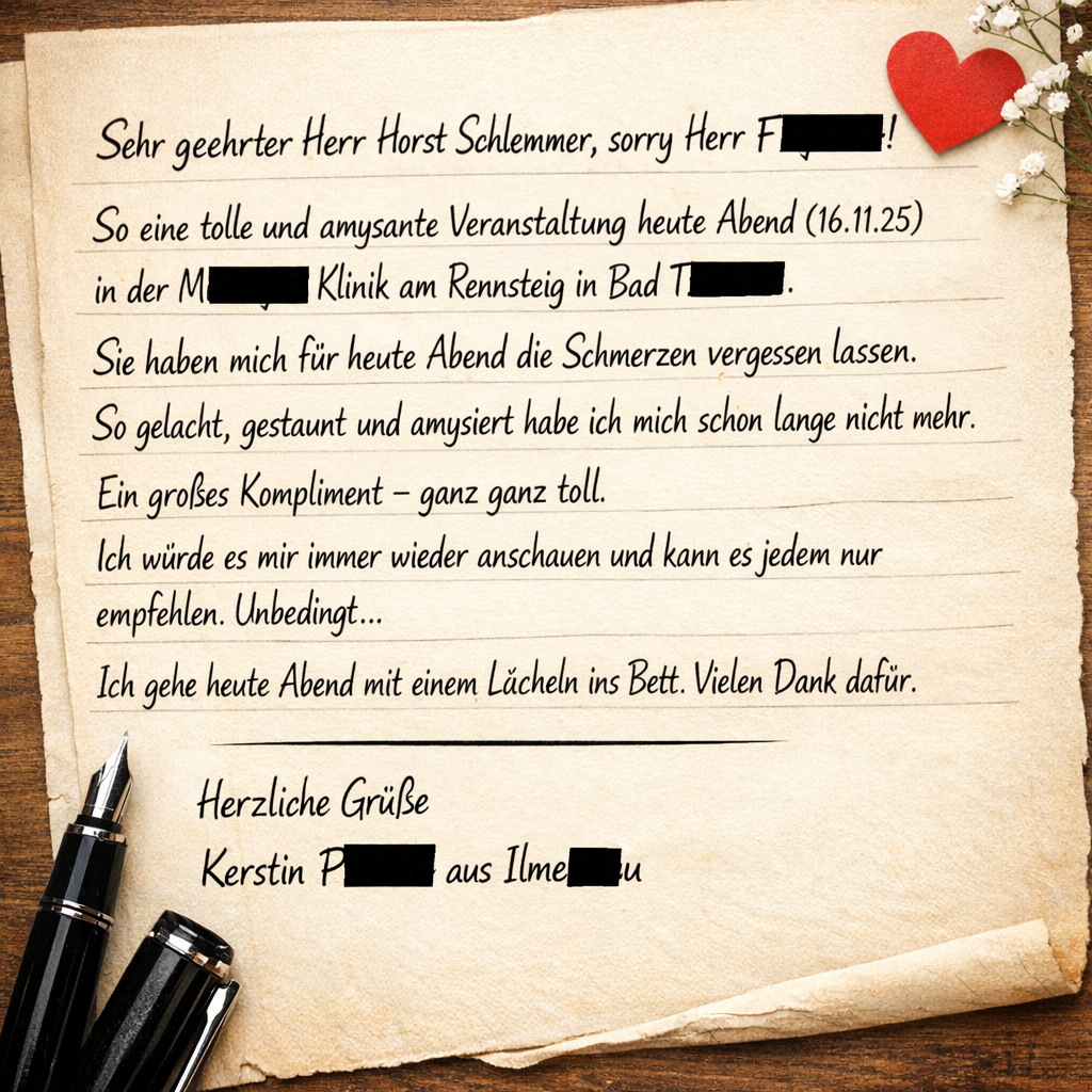 Heike. Mi 05 Nov 2008 13:15:30 CET. Unsere Betriebsfeier am 24.10.2008 im Alten Speicher in 99947 Kirchheilingen. Hallo Mathias, ich möchte mich nochmals im Namen aller Gäste, die bei unserer Betriebsfeier dabei waren, für den tollen und gelungenen Auftritt als Comedy-Parodie "Herr Schlimmer" bedanken. Du hast super Stimmung in den Saal gebracht und phantastisch parodiert. Mach weiter so, du bist nur weiterzuempfehlen, und das werden wir bei jeder sich bietenden Gelegenheit auch gerne tun.
